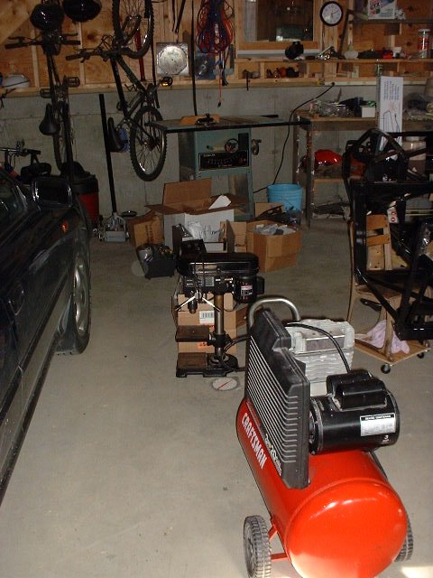 To help round out the shop's equipment, we went to my house and picked up some of the tools I used to build my airplane. We figured the same tools would be handy building the Cobra. Here's a shot of the pile of my tools just after they arrived in Nate's garage. That's my compressor in the foreground, and the Cobra frame on the right. Nellie's Subaru is to the left. Nate's car has been banished to the driveway to make way for the Cobra, but Nellie said that if we tried to use up her half of the garage with Cobra stuff too, we could just turn around and take that Cobra back where it came from! You can see another view of the tools as they arrived on the next page. |