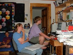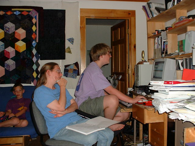 Amos is sitting on the couch at the left, while Nellie and Cale work on a computer program about bugs. On the wall over Amos' head is one of Nellie's amazing and beautiful quilts, under construction. You can read more about Nellie and the boys here. |
