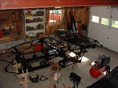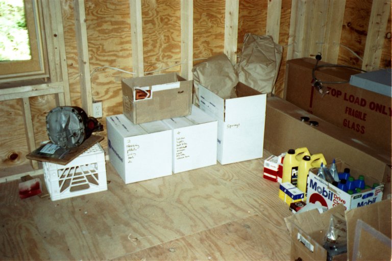 Behind him is the woodshed, which holds the firewood used to heat the house in the winter, and the Cobra body, sitting quietly on its body buck and grinning at Nate as he cleans the parts which will soon go inside it. |