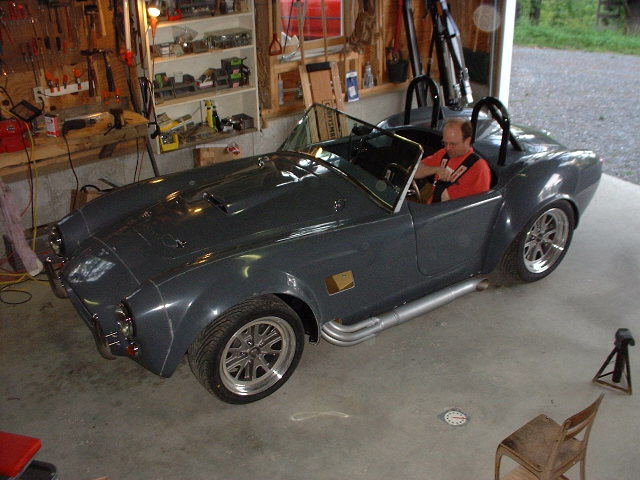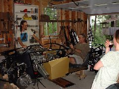 Little did we know how prophetic the checkered flag would be. But that's another story - told on the Events page. Incidentally, we were so eager to run the car that we drove it immediately after the wheels were mounted. Since the car wasn't registered and certainly wasn't legal, we only drove it on Nate's driveway and the private dirt road of his residential collective. |