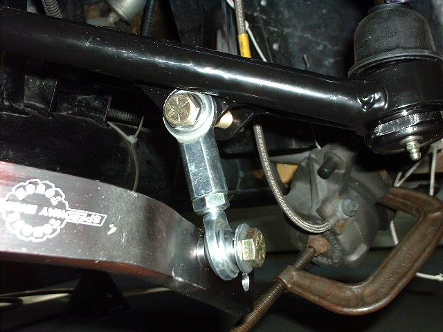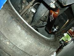 The drop link attaches to a hole in the rear of the lower control arm. This was expedient, but didn't give us our target roll stiffness.