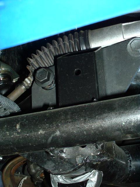 This is looking in between the two plates that support the steering rack and the front of the lower control arm. The three bolts in the front plate (to the left) attach the top of the bracket to the frame.