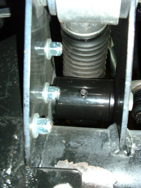 A shot of the bracket from below. Here you can clearly see the tab on the bottom of the bracket, and the bolt into the frame.