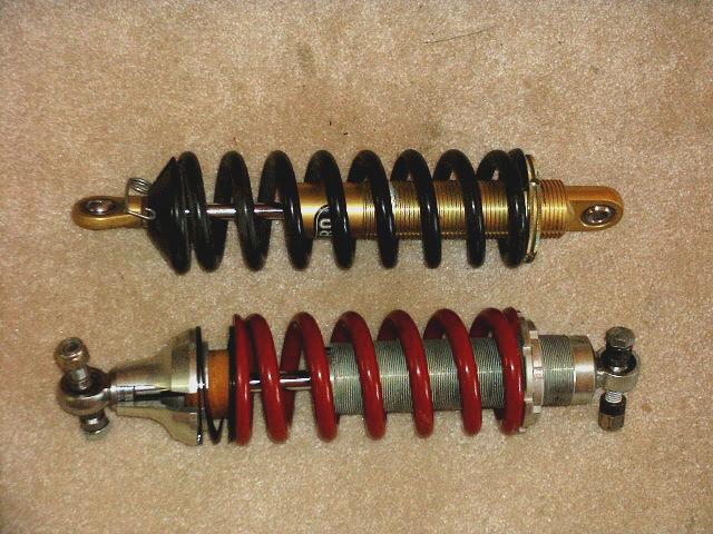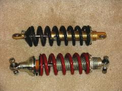 Here you can see the stock Pro Shock and spring (top) and the new Bilstein shock and spring. Note the machined aluminum "hat" on the bilstein, required to give proper clearance to the FFR control arms.