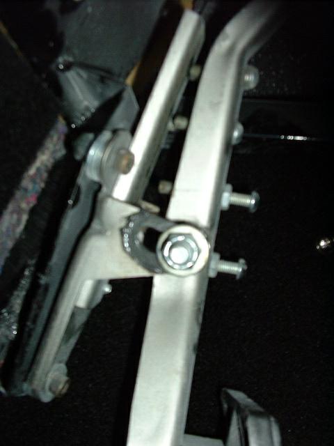 Here you can see the pedal and modified pivot. Note the large washers next to the pivot to help keep the pedal from rocking side to side as it slides.