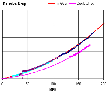 The red line is a binomial curve-fit to the "In Gear" data. The upward curvature is indicative of the aerodynamic portion of drag. The magenta points and curve are for a coastdown with the clutch in.