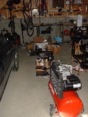 To help round out the shop's equipment, we went to my house and picked up some of the tools I used to build my airplane. We figured the same tools would be handy building the Cobra. Here's a shot of the pile of my tools just after they arrived in Nate's garage. That's my compressor in the foreground, and the Cobra frame on the right. Nellie's Subaru is to the left. Nate's car has been banished to the driveway to make way for the Cobra, but Nellie said that if we tried to use up her half of the garage with Cobra stuff too, we could just turn around and take that Cobra back where it came from! You can see another view of the tools as they arrived on the next page. |