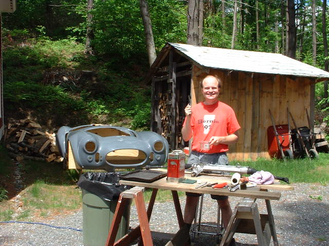 Behind him is the woodshed, which holds the firewood used to heat the house in the winter, and the Cobra body, sitting quietly on its body buck and grinning at Nate as he cleans the parts which will soon go inside it. |