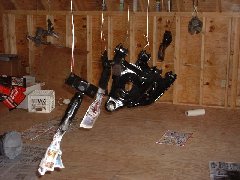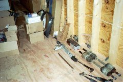 Parts PaintingWe're preparing most of the metal parts by cleaning and painting them with Eastwood paints, which come in several colors that look almost like unpainted iron, steel, and aluminum. It takes more time, but the parts will stay looking good a lot longer. Some heavily corroded parts will also receive a coat or two of Gempler's Rust Converter, which stabilizes rust and leaves a black surface which can be painted over. Our donor Mustang was from Arizona, and there is virtually no rust on the parts as they came from the car. However, the parts still need to be cleaned up, and some corrosion needed to be removed from the front spindles.