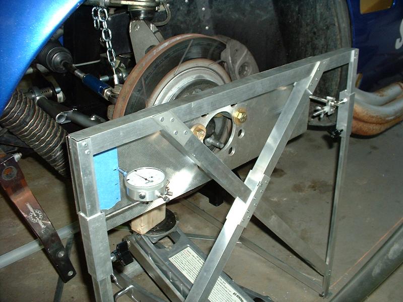 I also built a bump steer gauge, which allowed me to accurately check the bump steer after setting the caster. Since I was doing this with the spring/shock units out of the car (pretty much a necessity if you want to check bump steer), I also made some adjustable droop stops to hold the suspension at ride height level while the car was up on jack stands.