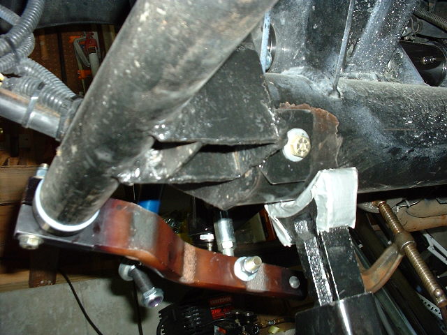 Note the tab at lower right, welded to the back of the square tube, which allows bolting the bottom of the bracket to the side of the 4" round frame tube. You can just see the bolt behind the tab.