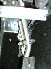 Above right is a photo of the modified Mustang throtte pedal and pivot. The series of screws in the upper part of the pedal serve as a progressive series of fulcrums. The result is in effect a cam with very low "lift" in the initial part of the range and progressively higher lift as you go through the range.