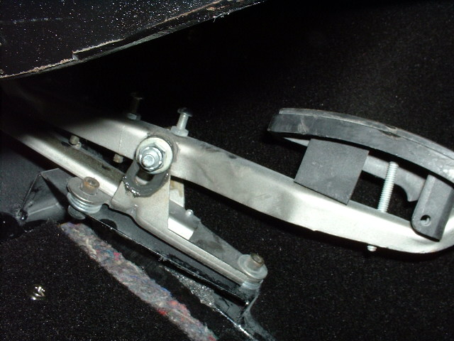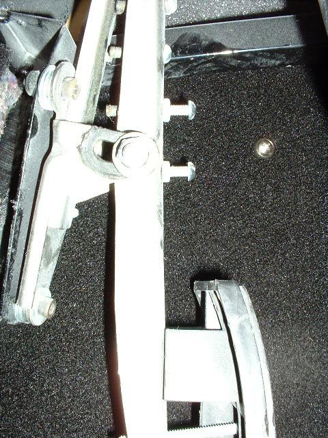 Here you can see the pedal and modified pivot. Note the large washers next to the pivot to help keep the pedal from rocking side to side as it slides.