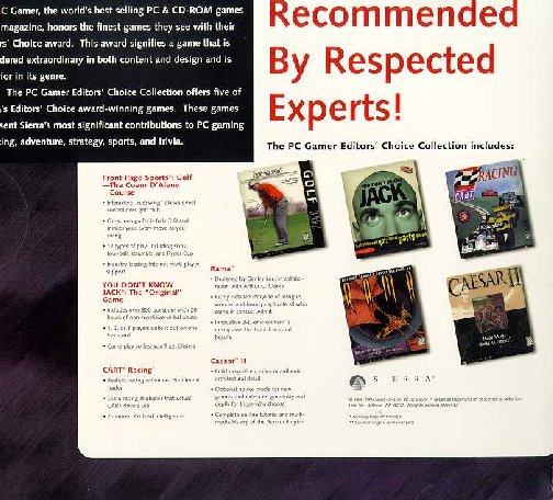 I've attached a scan of the front of the box and a partial scan of the back [above]. The Collection includes "Front Page Sports Golf", "Caesar II", "You Don't Know Jack", "Rama" and "CART Racing (formerly IndyCar Racing II)."